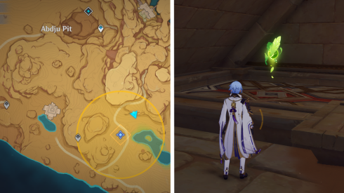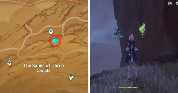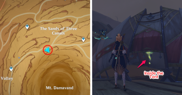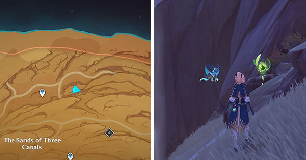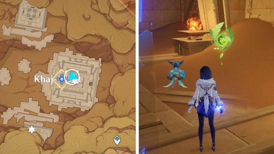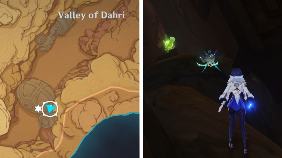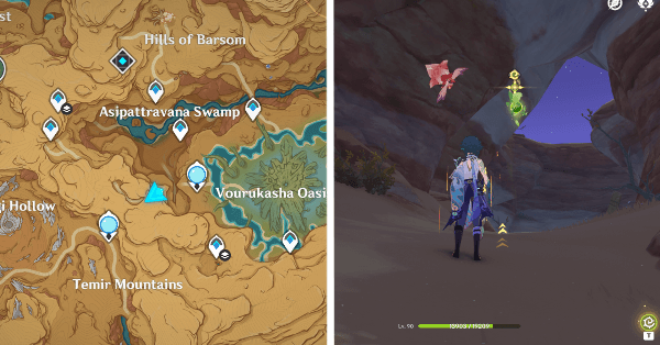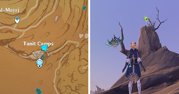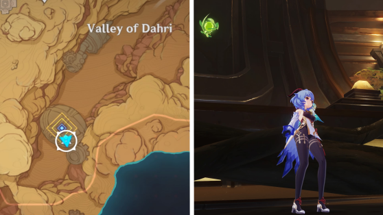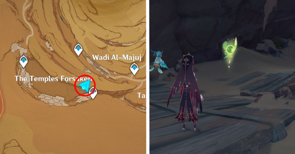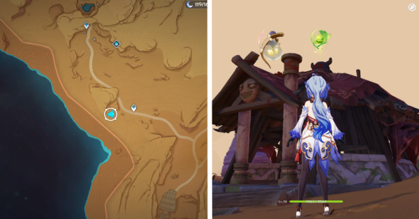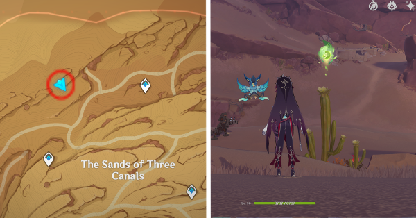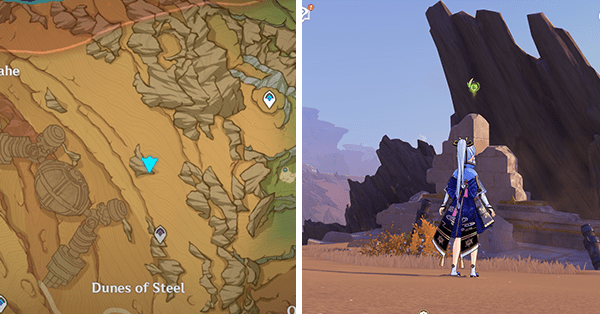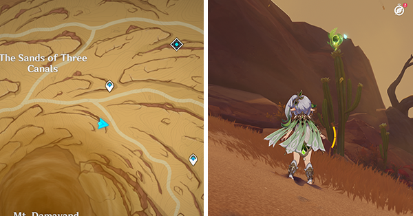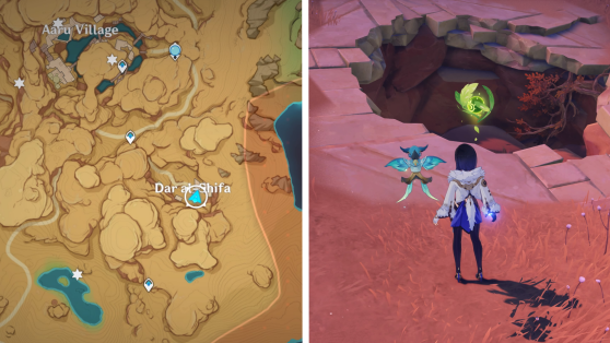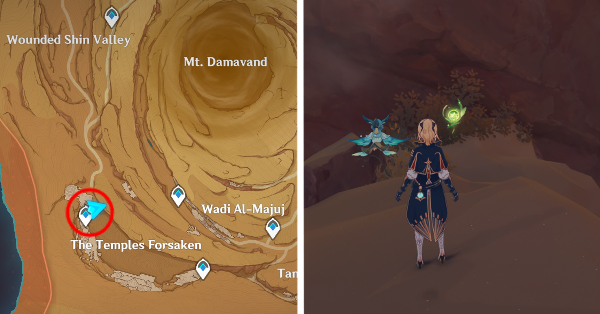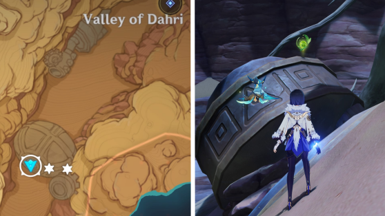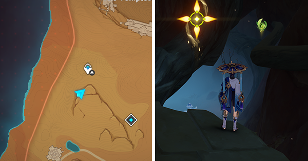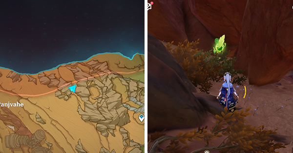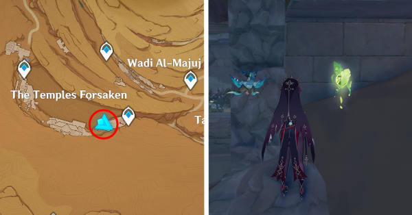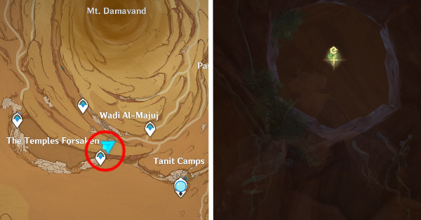 | 61 | ![]() Расположен внутри убежища Пустынников. На входе Паймон начнет говорить о слежке за одним из них. Следуйте за женщиной, идущей по дороге, пока она не назовет пароль. Используйте пароль на механизме у входа, чтобы открыть дверь. Дендрокул находится в первой комнате справа. |