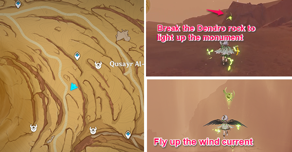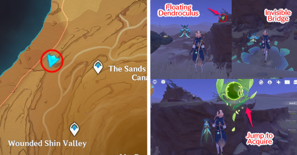 | 14 | ![]() Расположен высоко над землей. Активируйте Анемо-монумент, чтобы вызвать поток ветра. Двигайтесь вверх к Четырехлистному символу к востоку. Затем летите к Дендрокулу, пока не приземлитесь на невидимую платформу |