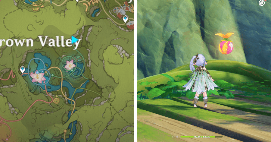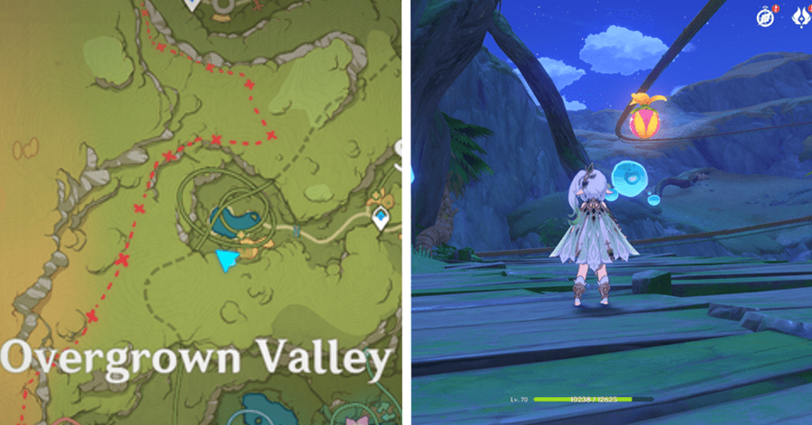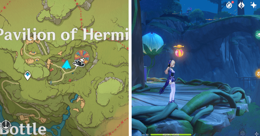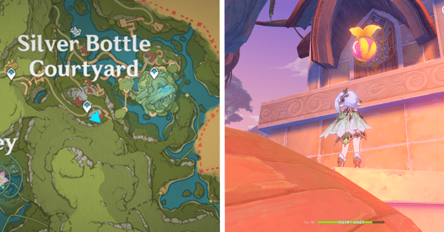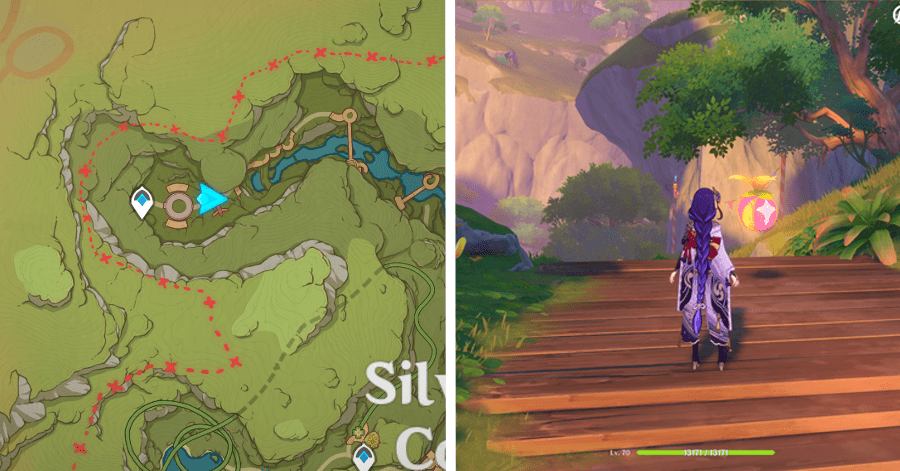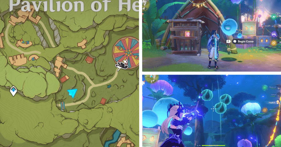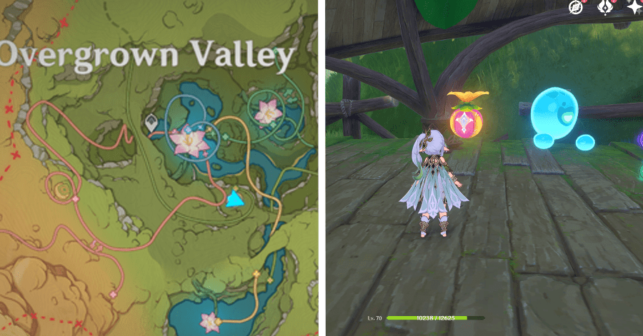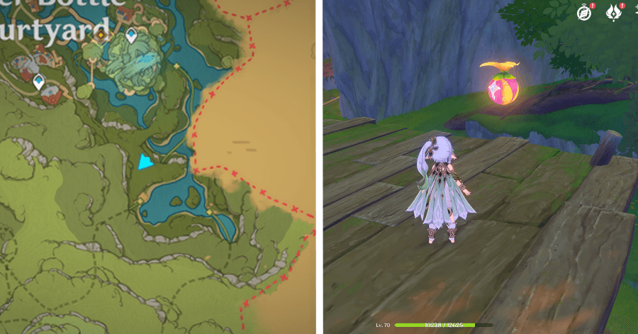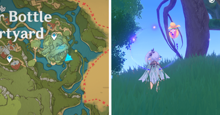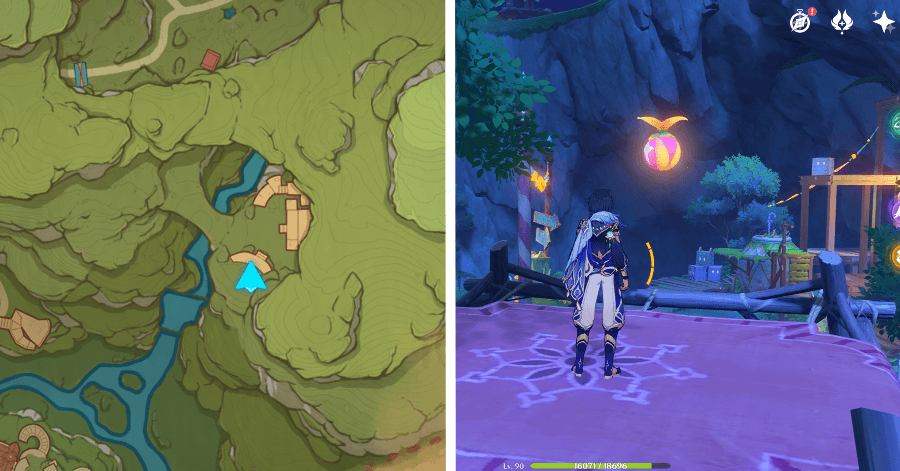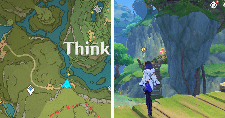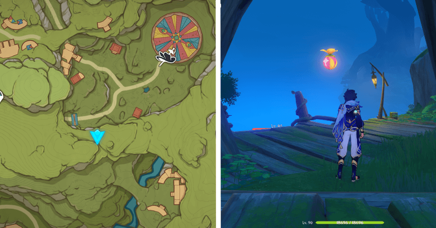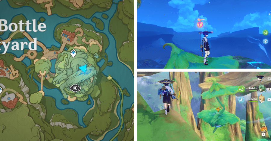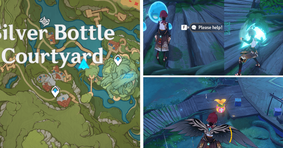 | 4 | ![]() Подойдите к этому месту в центре и попросите Капельку о помощи. Появится Анемо-вертушка, которая создаст ветряной поток |