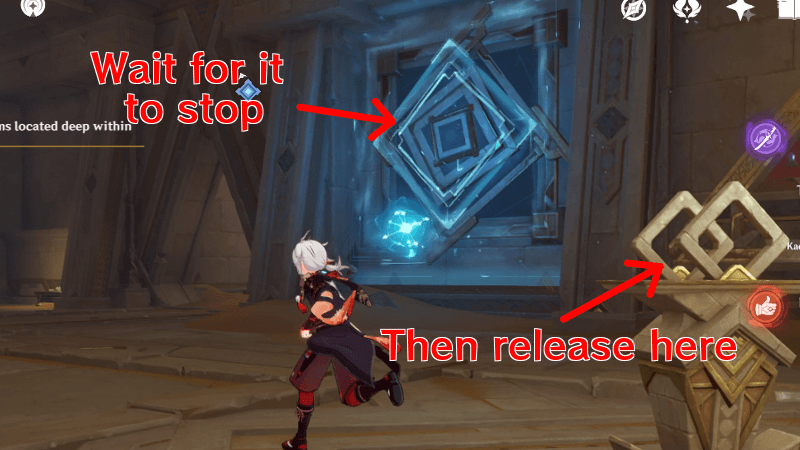 | 4 | ![]() Активируйте Призрачную основу, чтобы спуститься дальше и следовать за искрой. Выпустите ее из камня, как только большой «вентилятор» выключится, иначе искру сдует и вам придется начать сначала. |